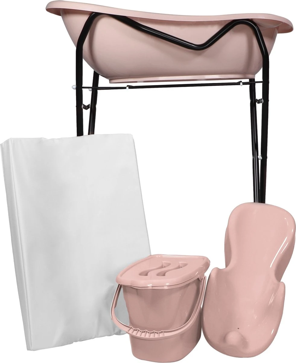 Het badje heeft een mooie vorm en is inclusief afvoer. Het badzitje kan gemakkelijk in het badje geplaatst worden door middel van zuignappen. De standaard is van metaal gemaakt met rubberen voetjes om de vloer te beschermen en is gemakkelijk in te klappen. Op het waskussen kun je je kindje verschonen en de luiers gooi je met gemak in de luieremmer! Kortom: deze badset is onmisbaar in de babykamer!