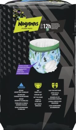 Maak kennis met … de Ninjamas Pyjama Pants! Pak bedplassen aan en laat je kind zelfverzekerd wakker worden met de Ninjama. De nachtluier biedt bescherming tegen lekken, de hele nacht lang. De Ninjamas met Pampers absorptie-technologie absorbeert vocht onmiddellijk voor een bescherming zoals je die nog nooit hebt gezien. De 360° tailleband past zich aan de taille van je kind aan voor een discrete en comfortabele pasvorm net zoals bij gewoon ondergoed, zodat je kind elke dag opgewekt wakker wordt. Net zoals bij jou, komt de veiligheid van je kind bij ons op de eerste plaats: De Ninjamas Pyjama Pants zijn dermatologisch getest, vrij van EU-parfumallergenen (zoals gereglementeerd in de regelgeving voor cosmetica N° 1223/2009) en gecertificeerd door Standard 100 door Oeko-Tex.Wil je weten wat de bestanddelen zijn van onze producten? Bezoek Pampers.nl