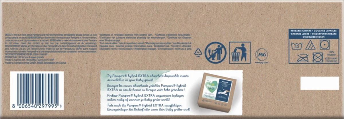Een systeem dat uit twee delen bestaat: een wasbare luier en een wegwerpbare absorberende toplaag van plantaardige oorsprong. Samen bieden ze de vertrouwde droogheid van Pampers en zijn Oeko-Tex gecertificeerd. De toplagen zijn getest en goedgekeurd door de dermatologen van de SHA en bevatten geen van de 26 EU parfumallergenen. Om te starten, ontdek onze probeerverpakking, vervolledig dan je collectie met het pak met 3 wasbare luiers en kies uit 2 absorptieniveaus: normal of extra.