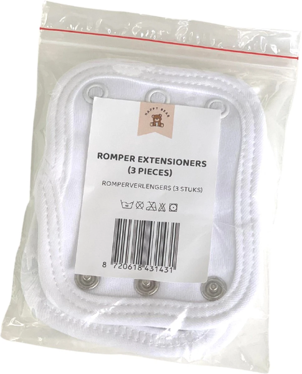 De romperverlenger set wordt geleverd in een setje van 3 stuks en is te gebruiken op de bijna alle rompers.
